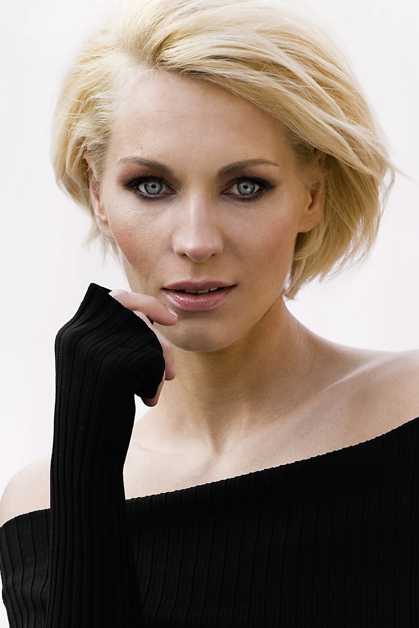 Die Smudged Eyes wurden mit dunklen, rauchigen Farbtönen geschminkt und mit einem mittleren, warmen Farbton oberhalb der Lidfalte verblendet, um einen Übergang zu schaffen und die blauen Augen zu betonen. Ein dunkler Lidschatten am unteren Wimpernkranz intensiviert den rauchigen Look. Die Lippen wurden in klassischem Rot oder Nude gehalten, was beides perfekt mit dem intensiven Augen-Make-up harmoniert.