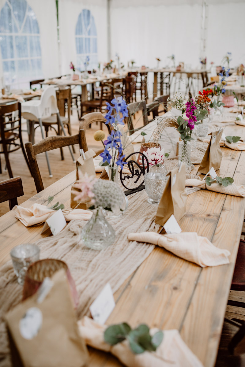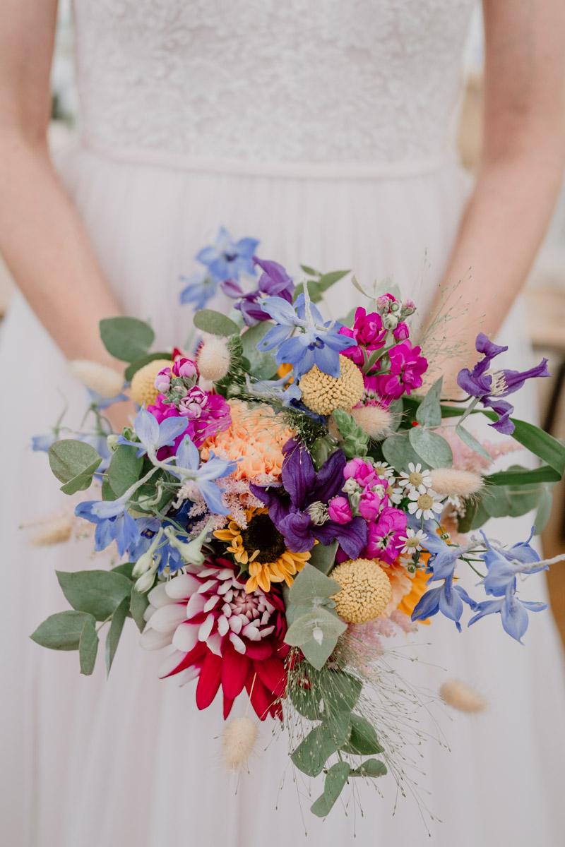 Der hochgesteckte Look ist ideal für lange Feiern und betont mit dem Spitzenkleid von Sana Lindström perfekt die Anmut der Braut – ob bei einer Sommerhochzeit im Freien oder einer Zeremonie in der Kirche. Die schönen Wiesenblumen stammen von Artis Floralis, Lisa Rothstein.