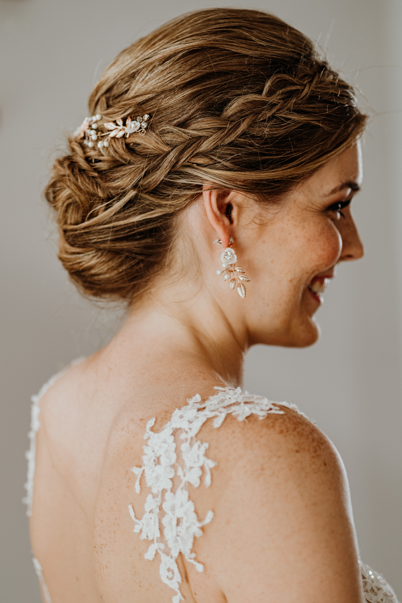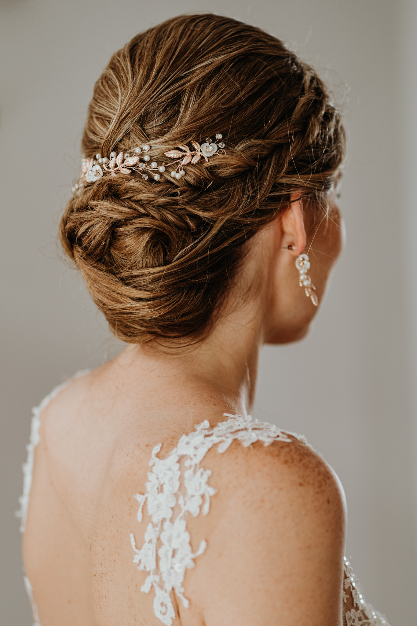 Bei der Steckfrisur durfte ich als Brautstylistin den Fokus auf die romantischen Fischgräten-Flecht-Elemente und die Haltbarkeit legen. Vor allem war der Braut wichtig, das auch von vorne und seitlich sichtlich geflochtene Haare sichtbar sein sollten.