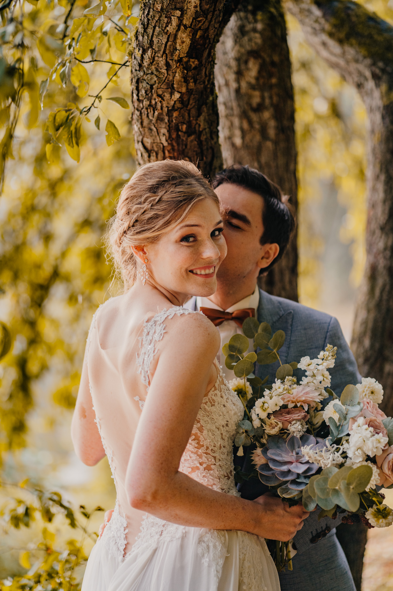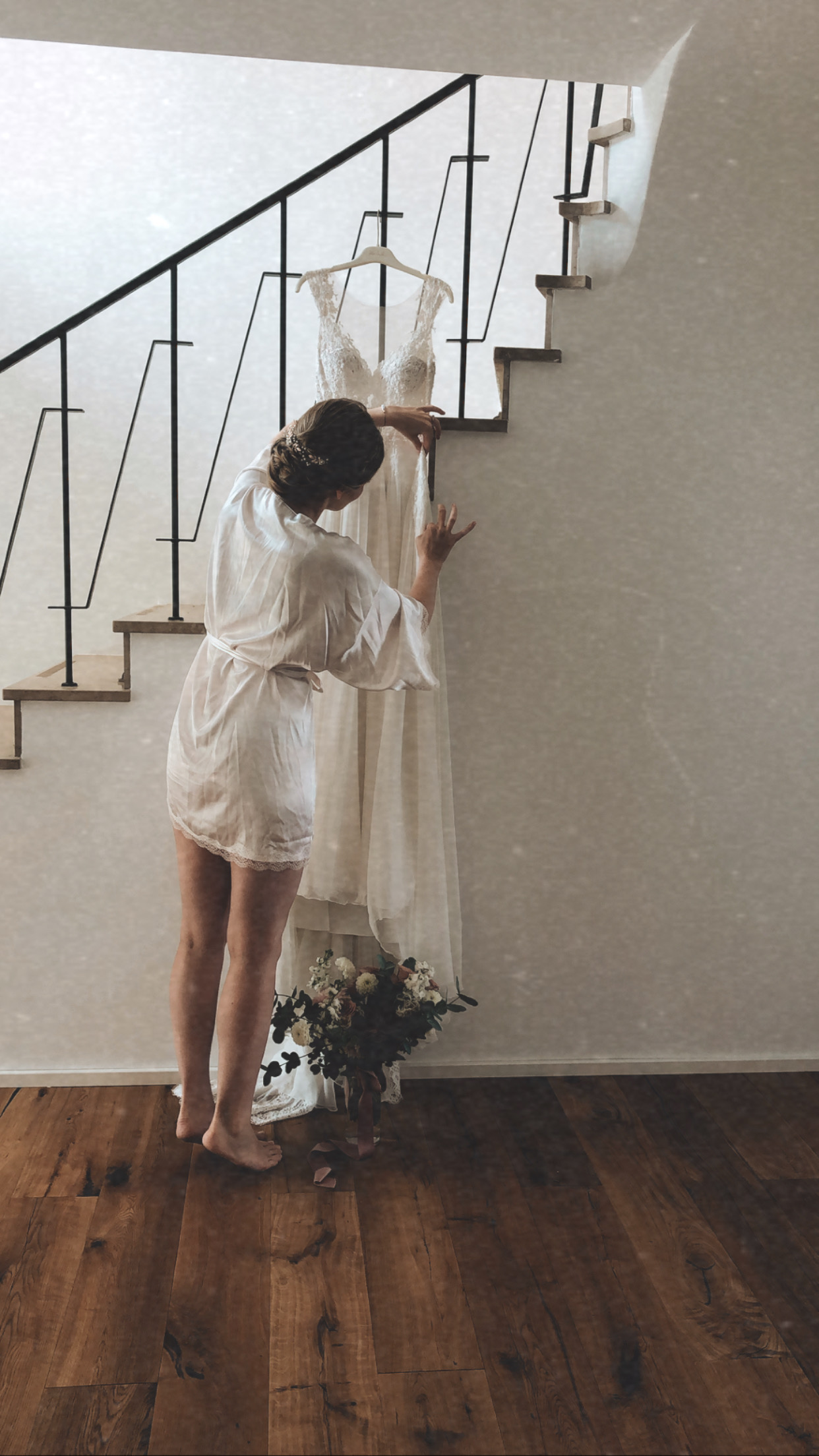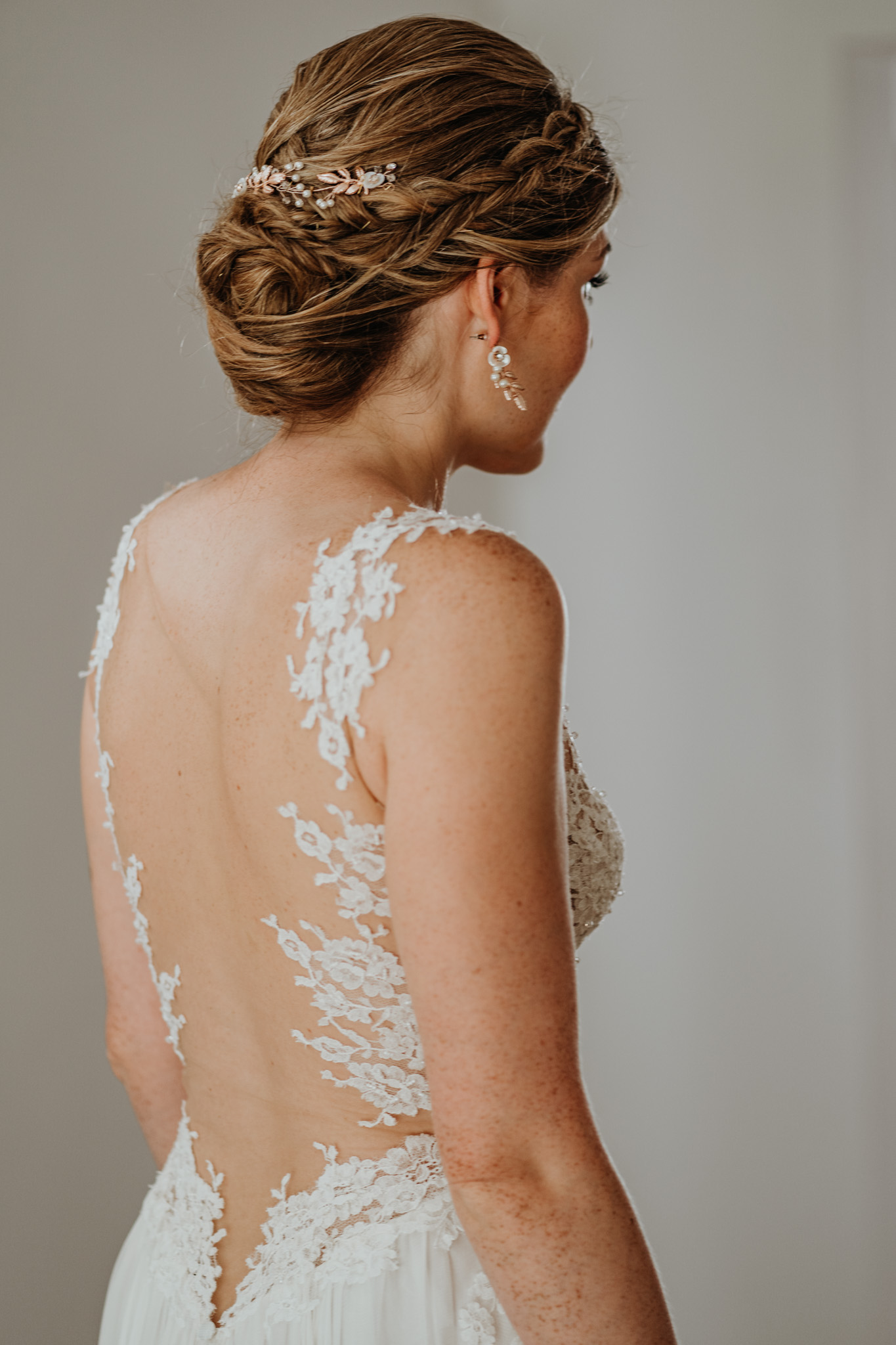 Das leichte Make-up ohne viel Puder und Deckkraft betont die natürliche Zartheit der Haut, während die geflochtenen Elemente der Frisur einen romantischen und verspielten Touch hinzufügen. Den Look habe ich genau nach den Wünschen der Braut gestaltet und perfekt passend zu dem feinen Spitzen-Brautkleid von Brautblüte.