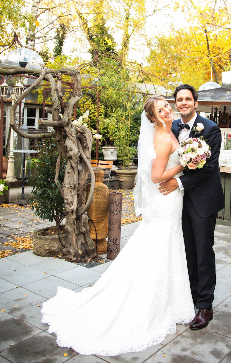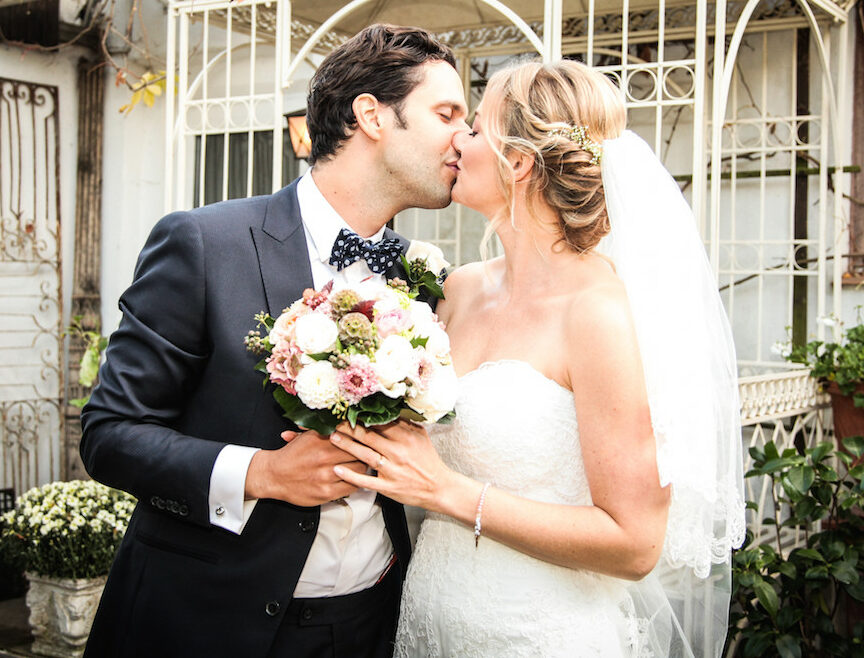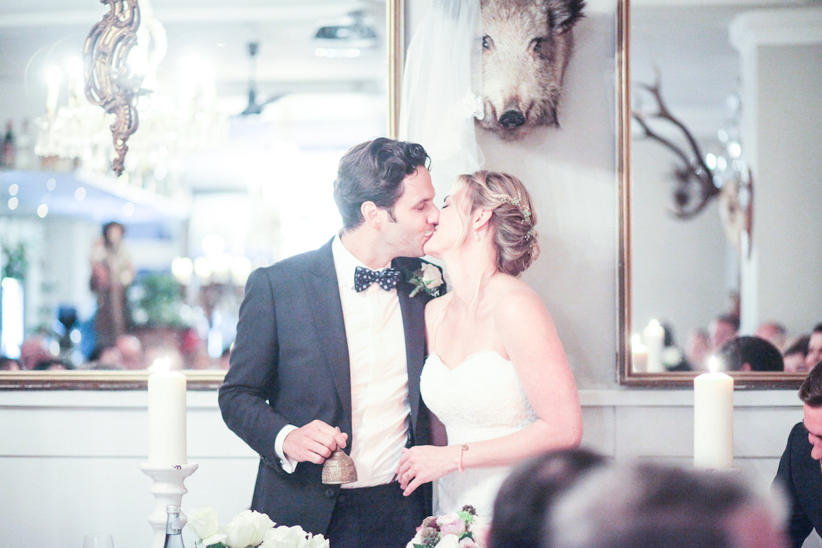 Die Braut wünschte sich einen tiefen Dutt mit eingedrehten Partien, der mit ihrem Schleier harmoniert.