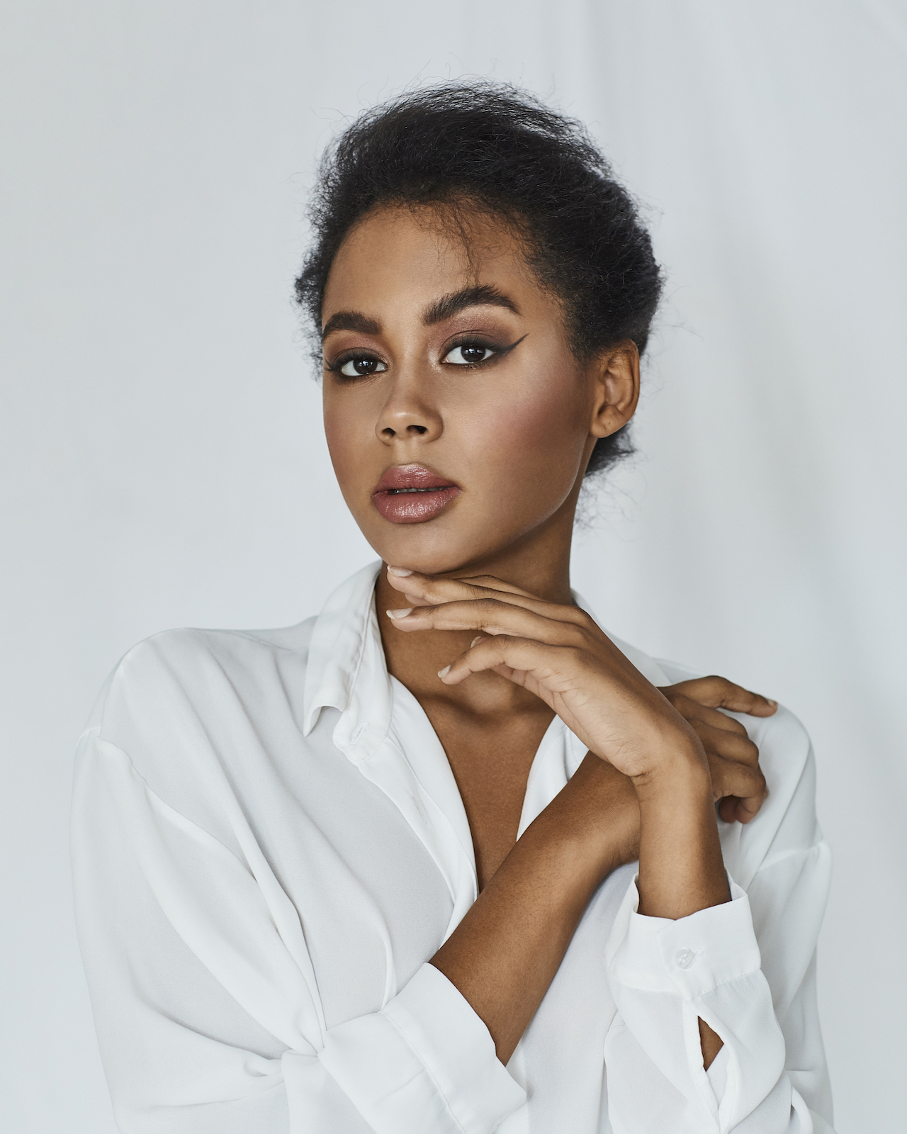 Intensiv geschminkte Augen mit einem Eyeliner-Wing, der den Blick betont. Warme und neutrale Nude-Töne sorgen für einen frischen Teint, während die glänzenden Lippen einen modernen Akzent setzen.
