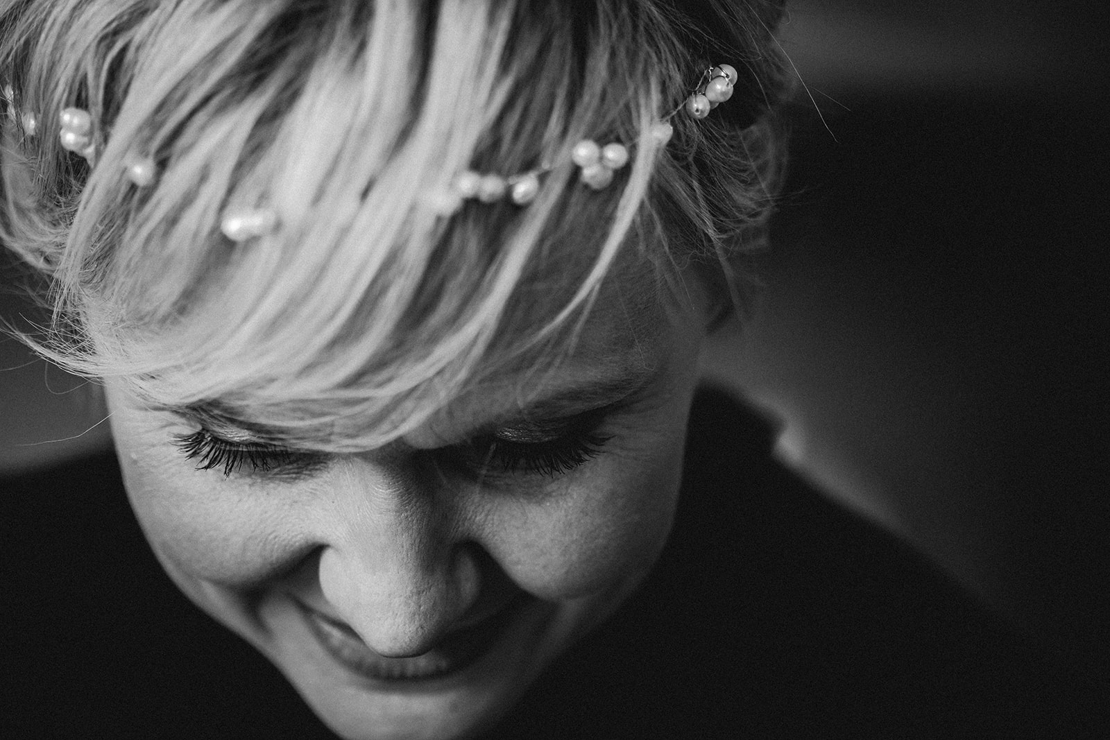 Die Frisur wurde mit sanften Wellen und einem subtilen Volumen gestaltet, um einen romantischen und dennoch modernen Look zu kreieren. Mit einzelnen Akzenten wurde ein feiner Kranz eingearbeitet der den femininen Charme betont.