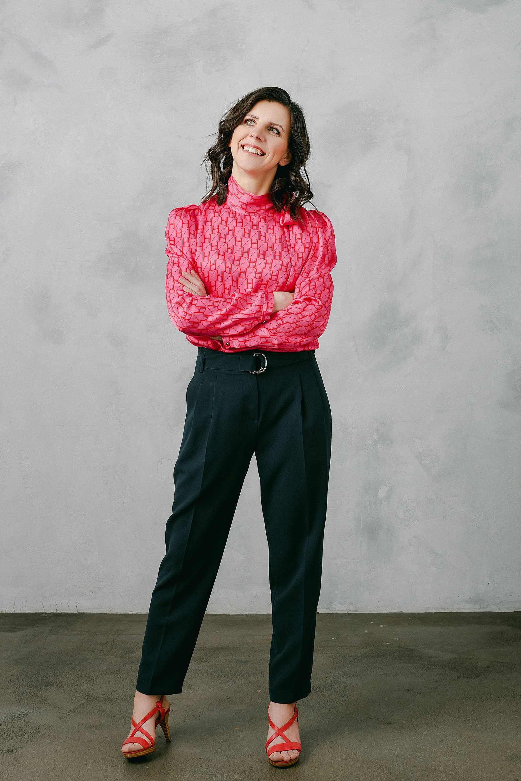 Die Haare wurden lässig gestylt, um einen natürlichen, eleganten Look zu schaffen, der optimal zur Branche und Kleidung der Kundin passt. Dieses kameragerechte Styling betont die Gesichtszüge und sorgt für eine ansprechende Präsentation.