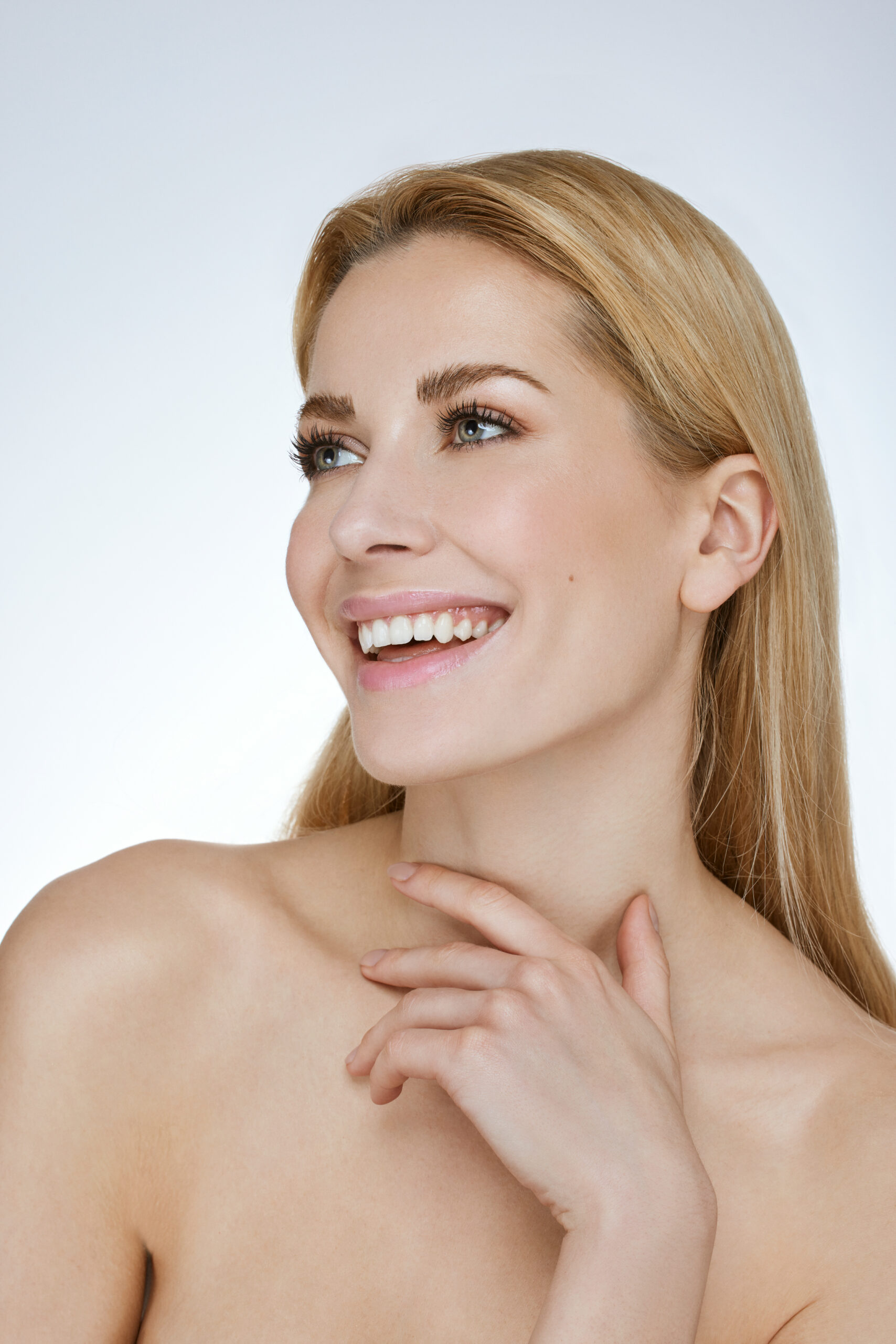 Dieser exakt geschminkte – fast ungeschminkt wirkende Look lässt die Haut strahlen und eignet sich perfekt für Beauty-Shootings oder Drehs. Die Haut wirkt gesund und gepflegt, was den modernen, dezenten Beauty-Look abrundet. Ideal, um Kosmetikprodukte wie Cremes, Seren oder Beauty-Tools zu präsentieren.