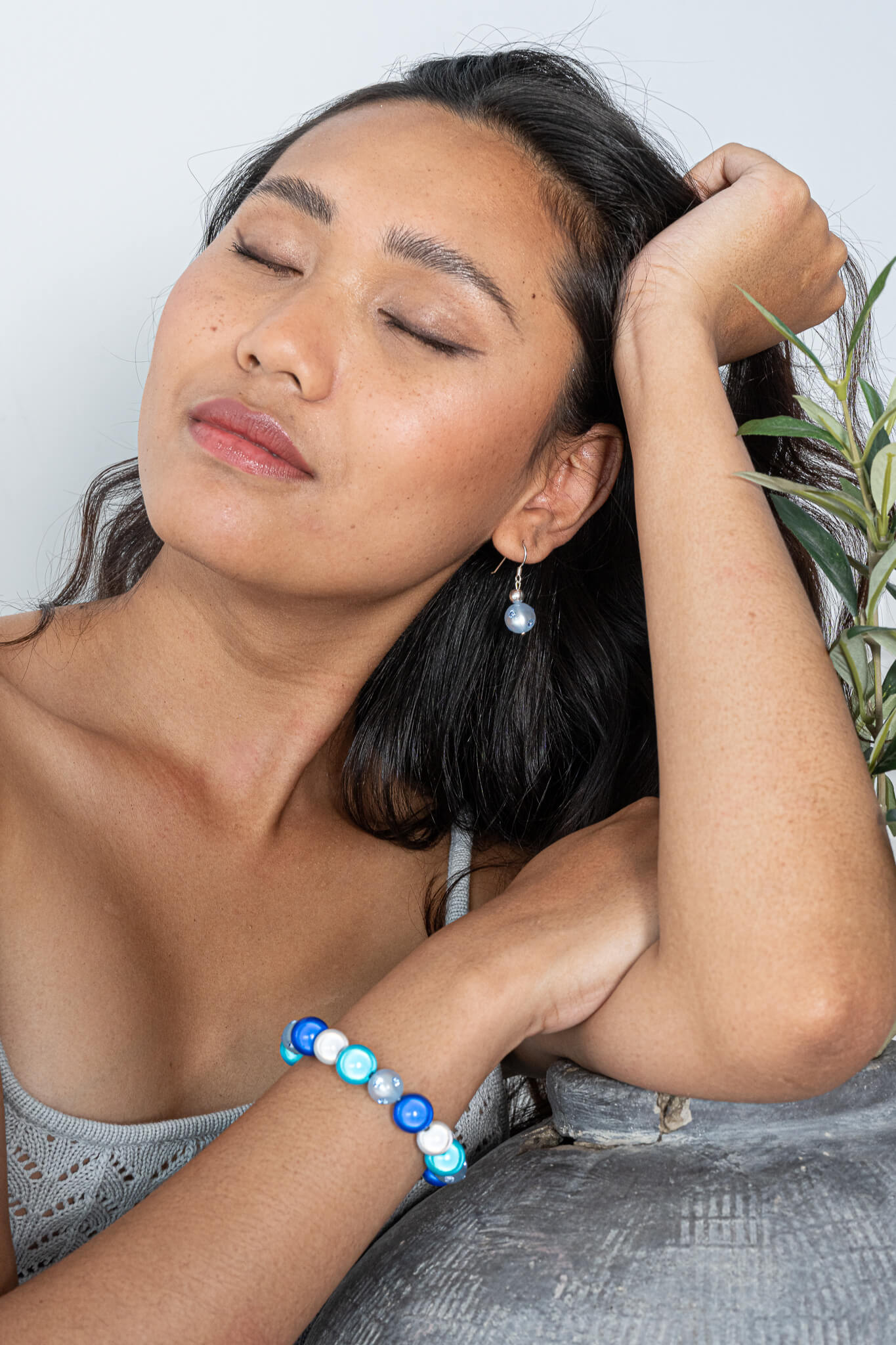 Das Haar wurde in einem sleek und glatten Look gestylt, wobei der minimalistische Ansatz beibehalten wurde. Der Look wirkt modern und zurückhaltend, ohne vom Schmuck oder dem Gesicht abzulenken. Die schlichte, glatte Textur sorgt für ein elegantes und gepflegtes Finish.