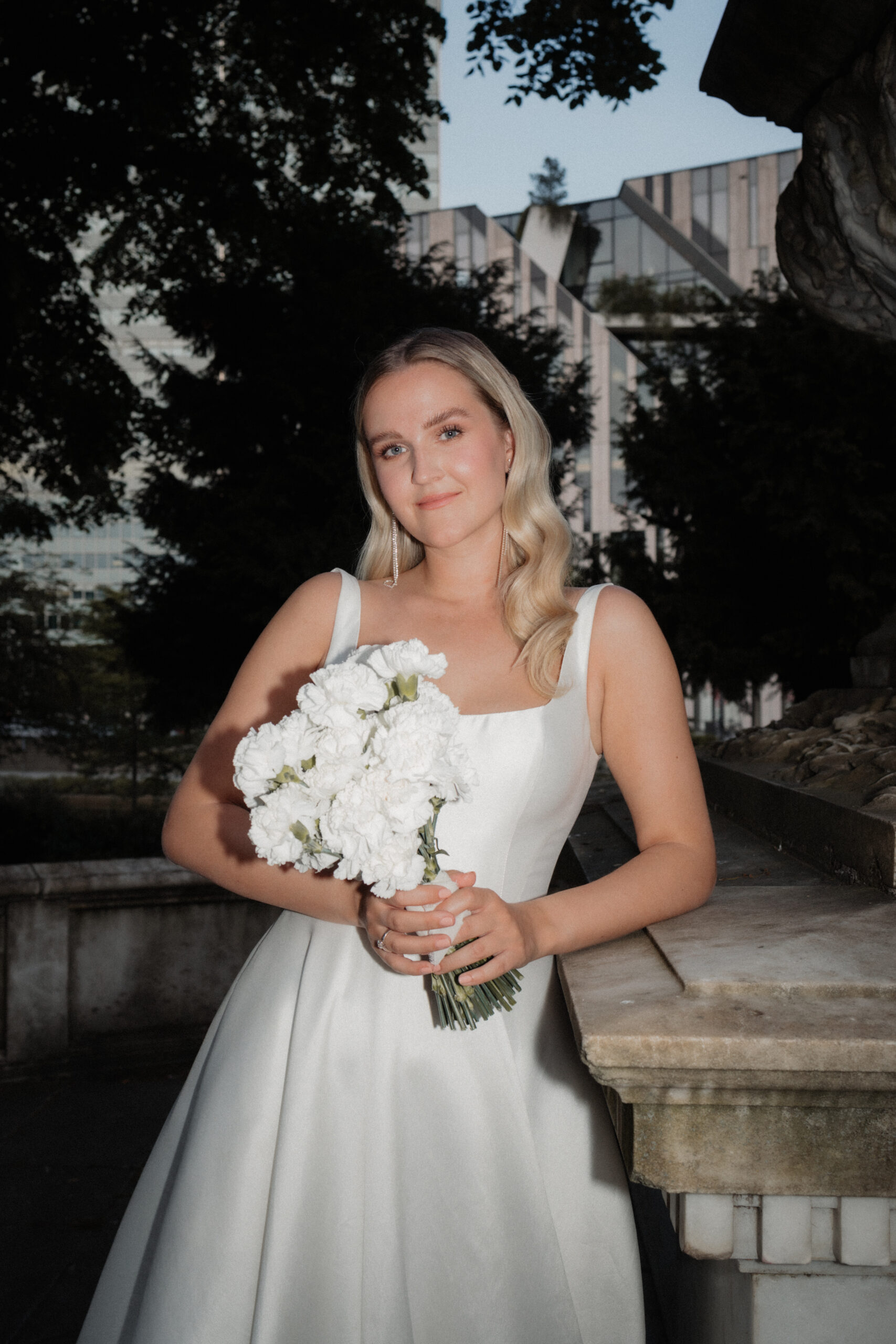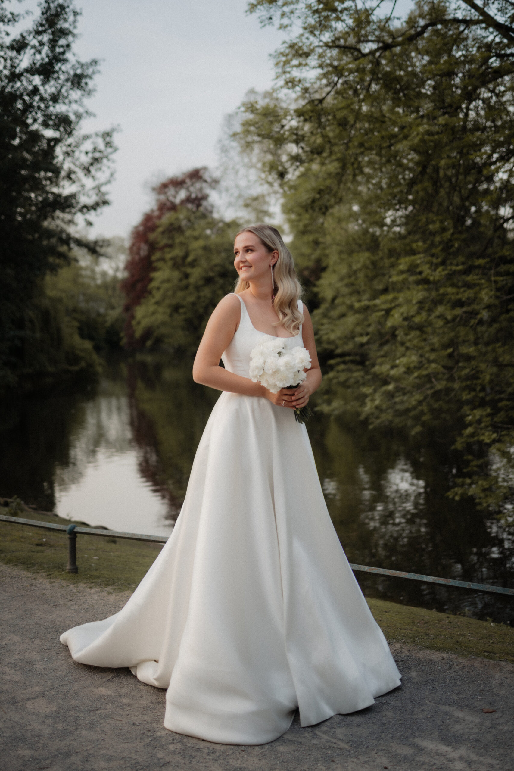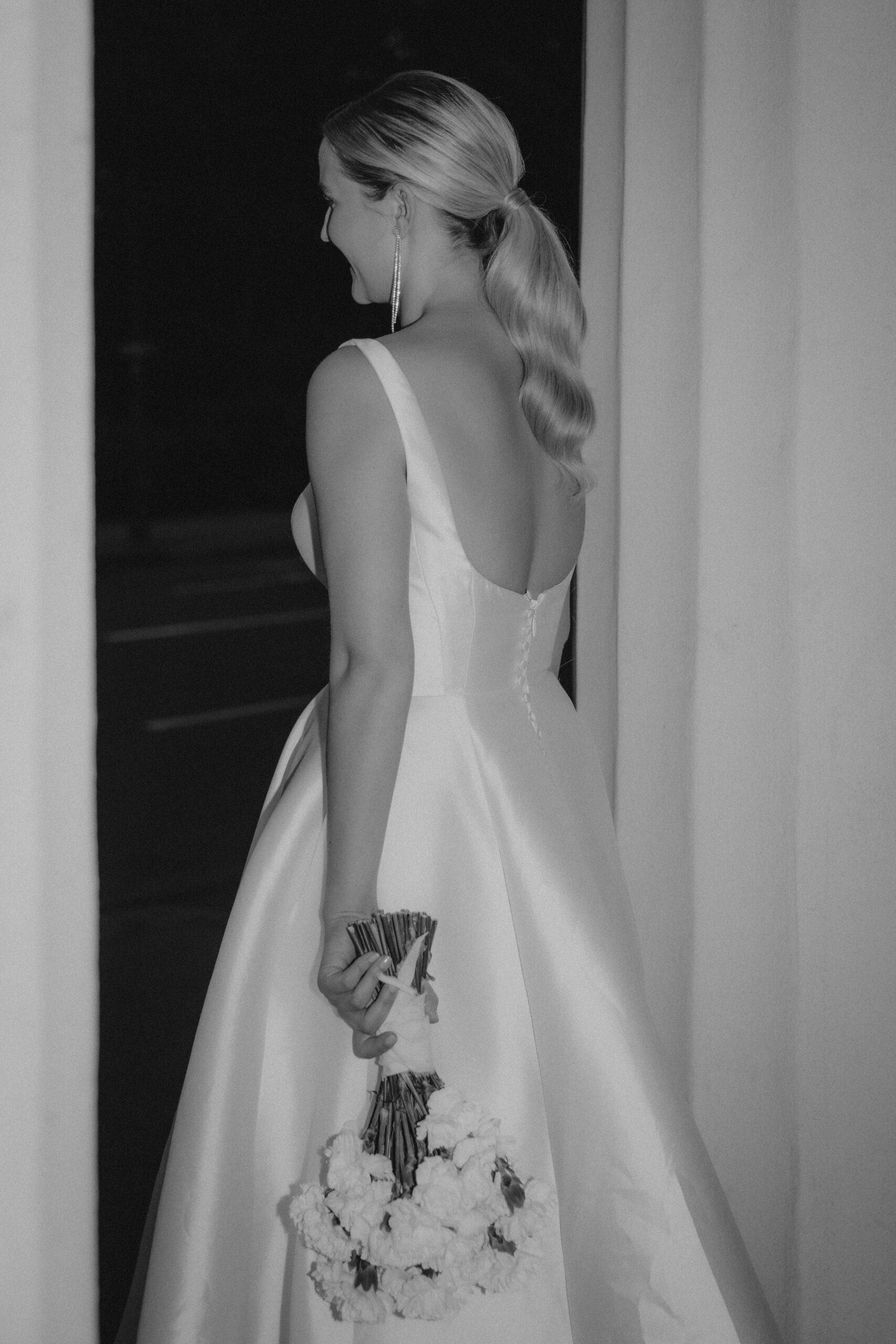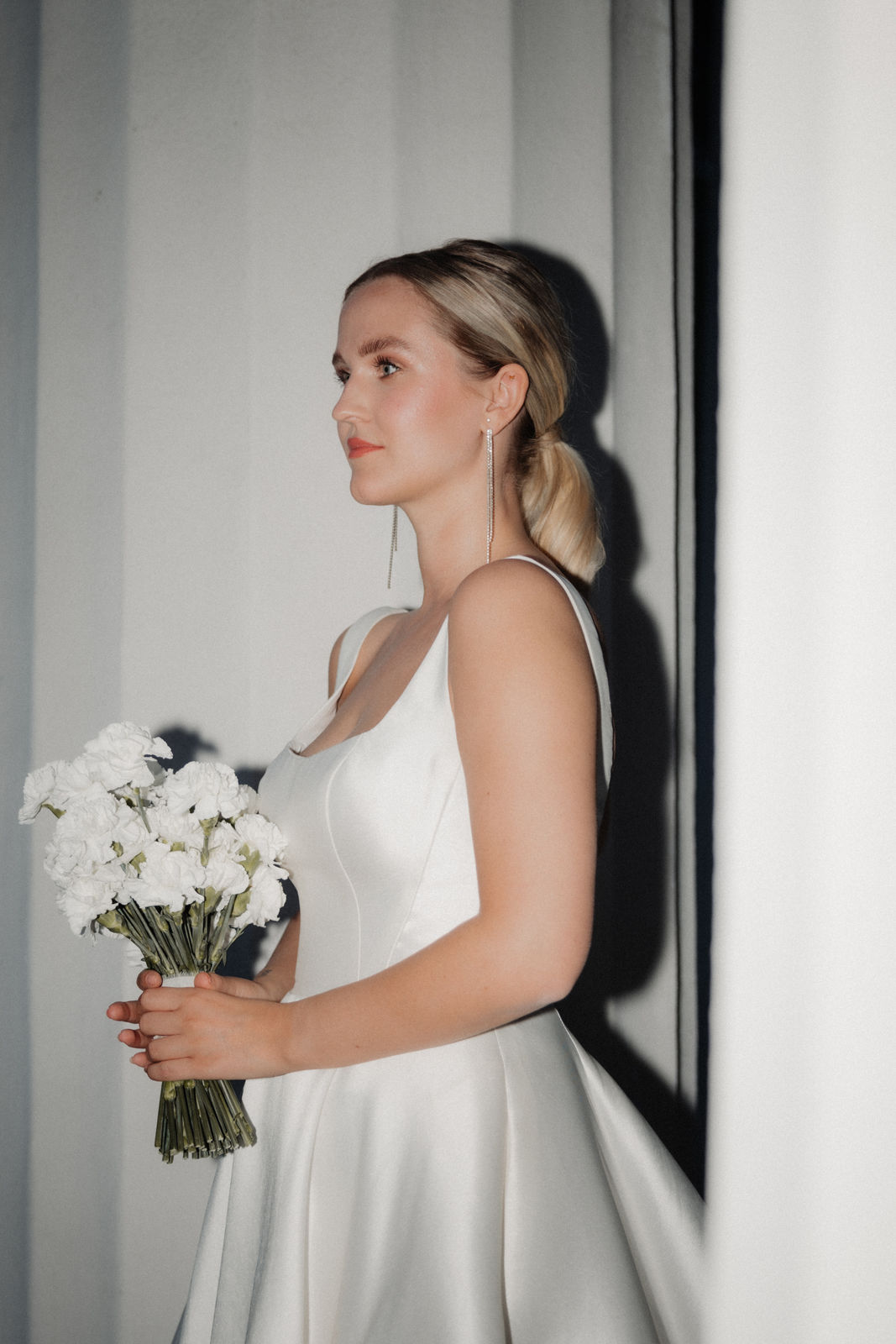 Das schlicht-elegante Brautkleid von I Am Yours und die Blumen von The Blooming Bliss ergänzen den Style perfekt.