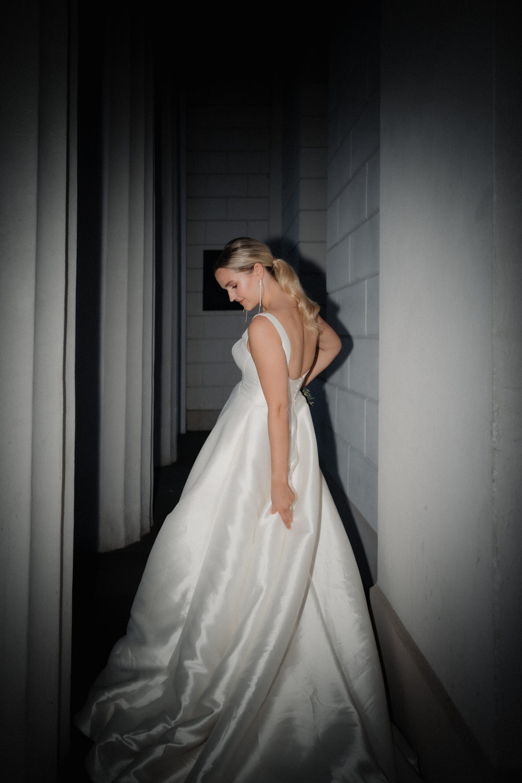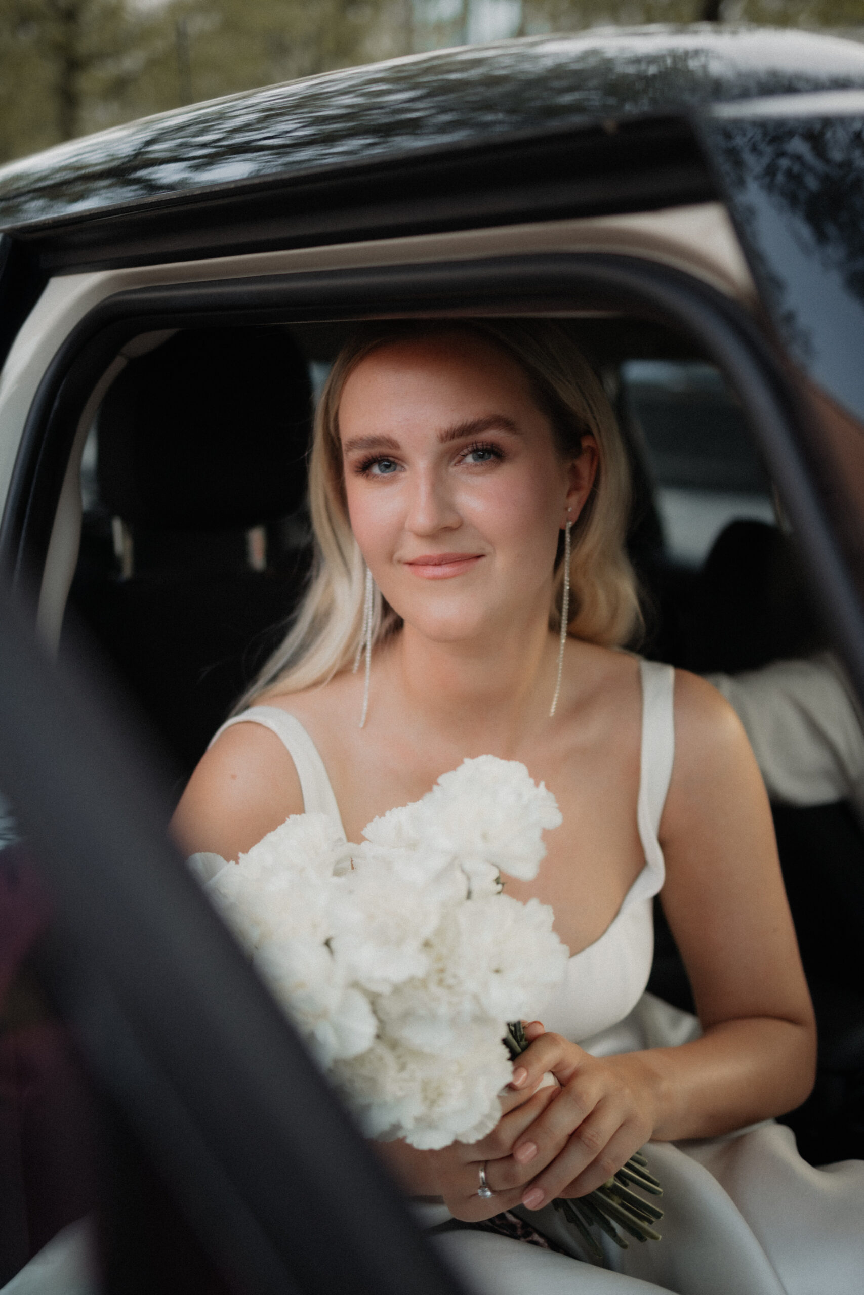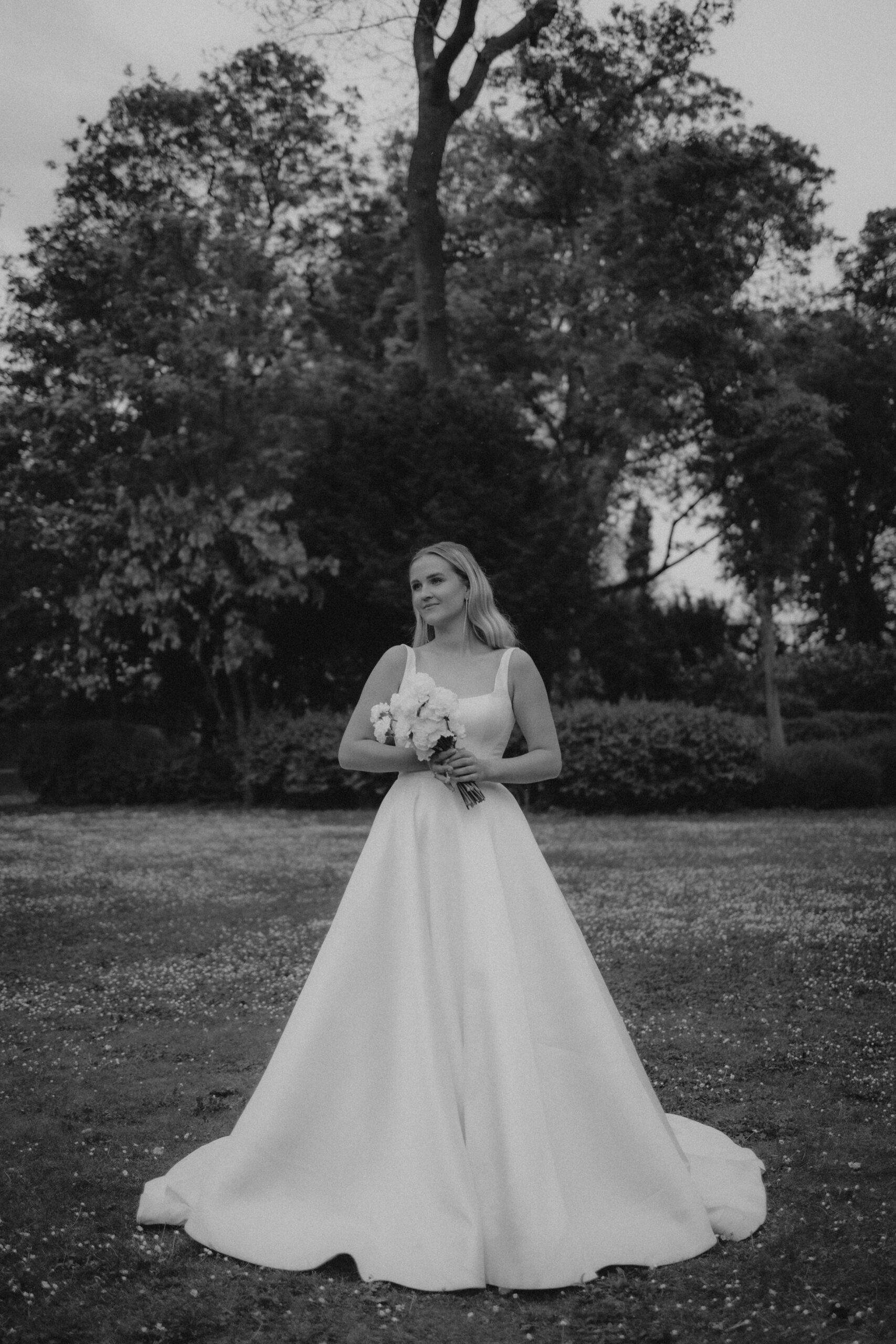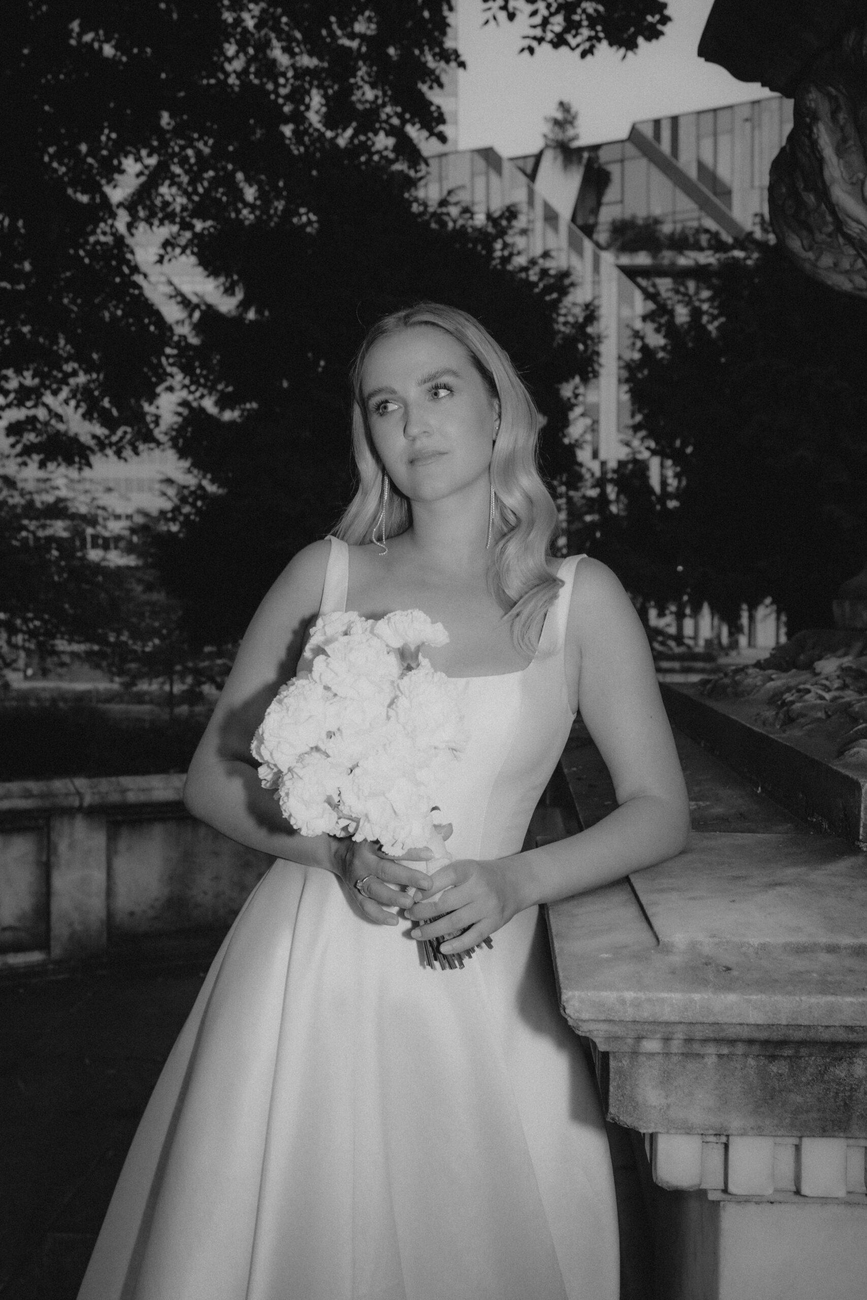 Das schlicht-elegante Brautkleid von I Am Yours und die Blumen von The Blooming Bliss ergänzen den Style perfekt.