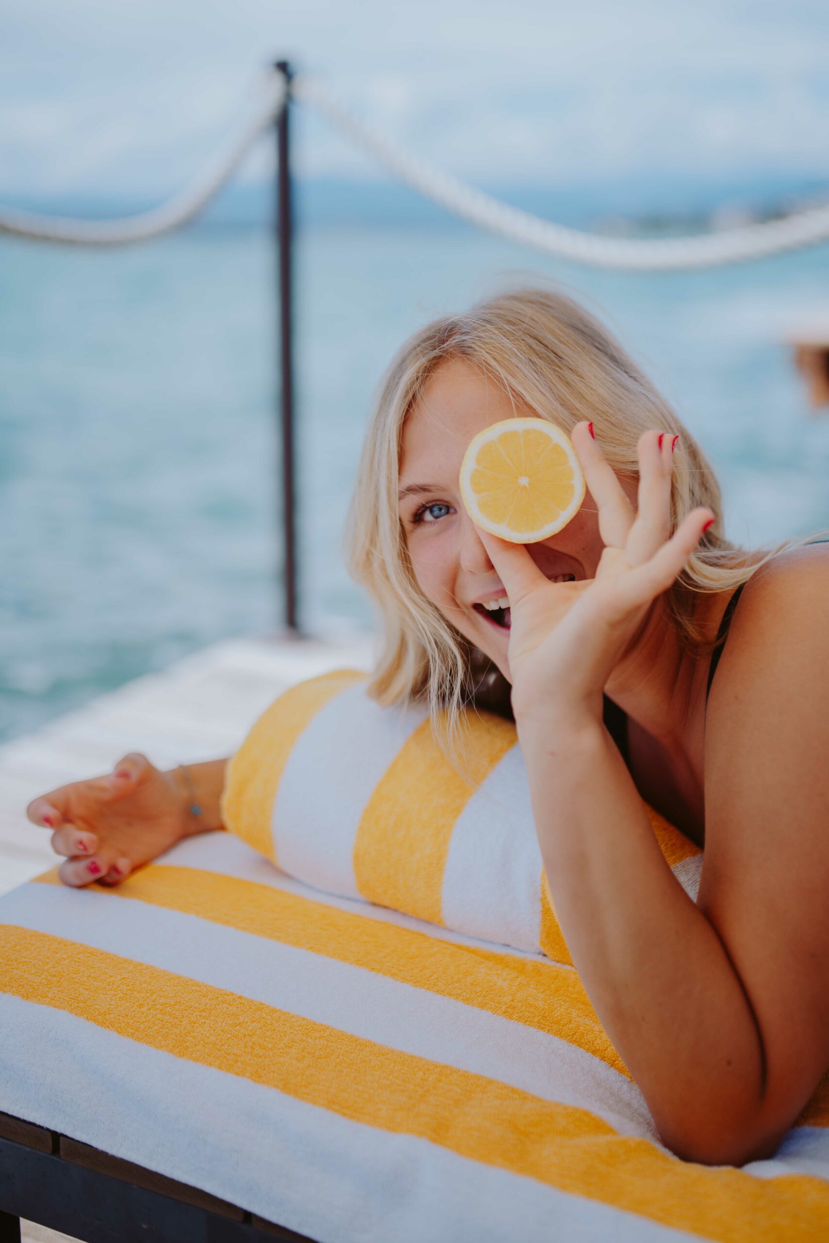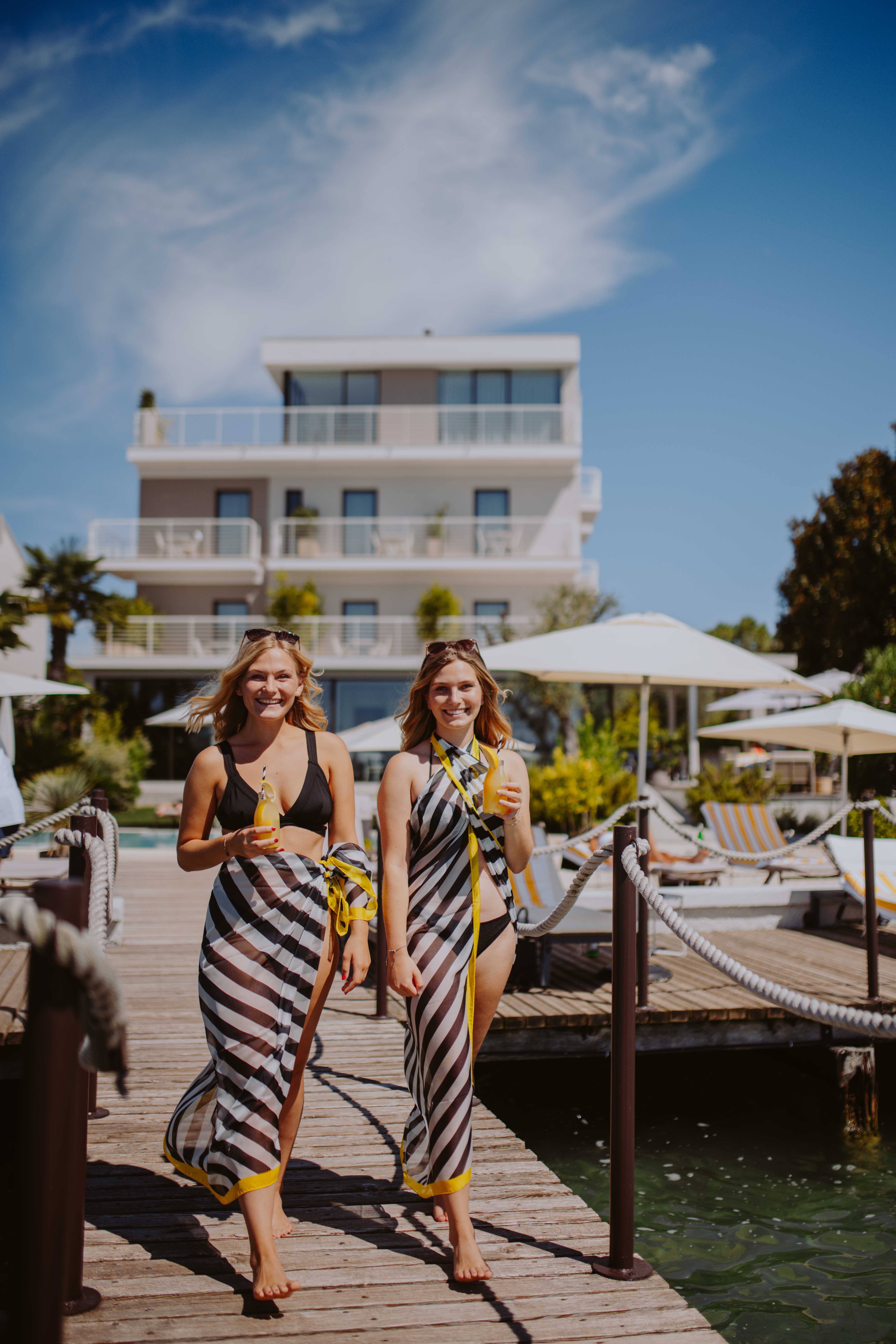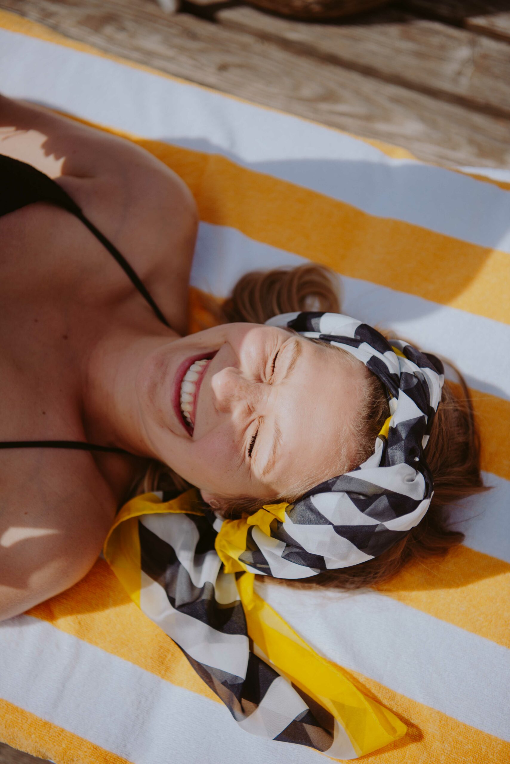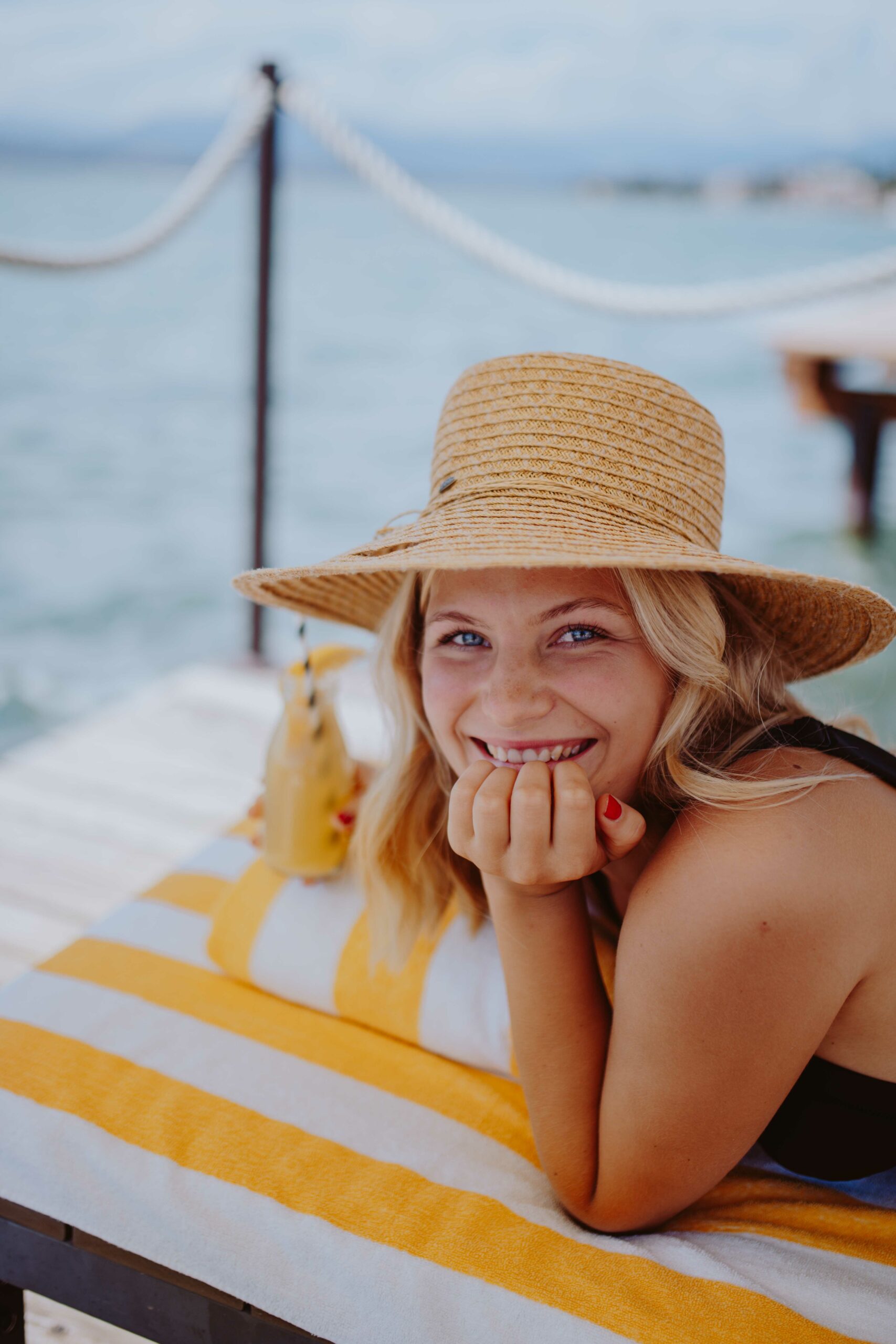 Die Natürlichkeit des Stylings unterstreicht unbeschwerte Pool-Atmosphäre und die entspannte Stimmung des Bildes.