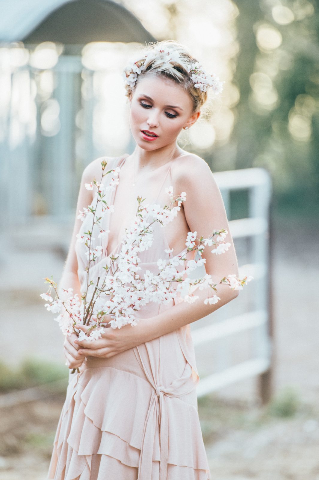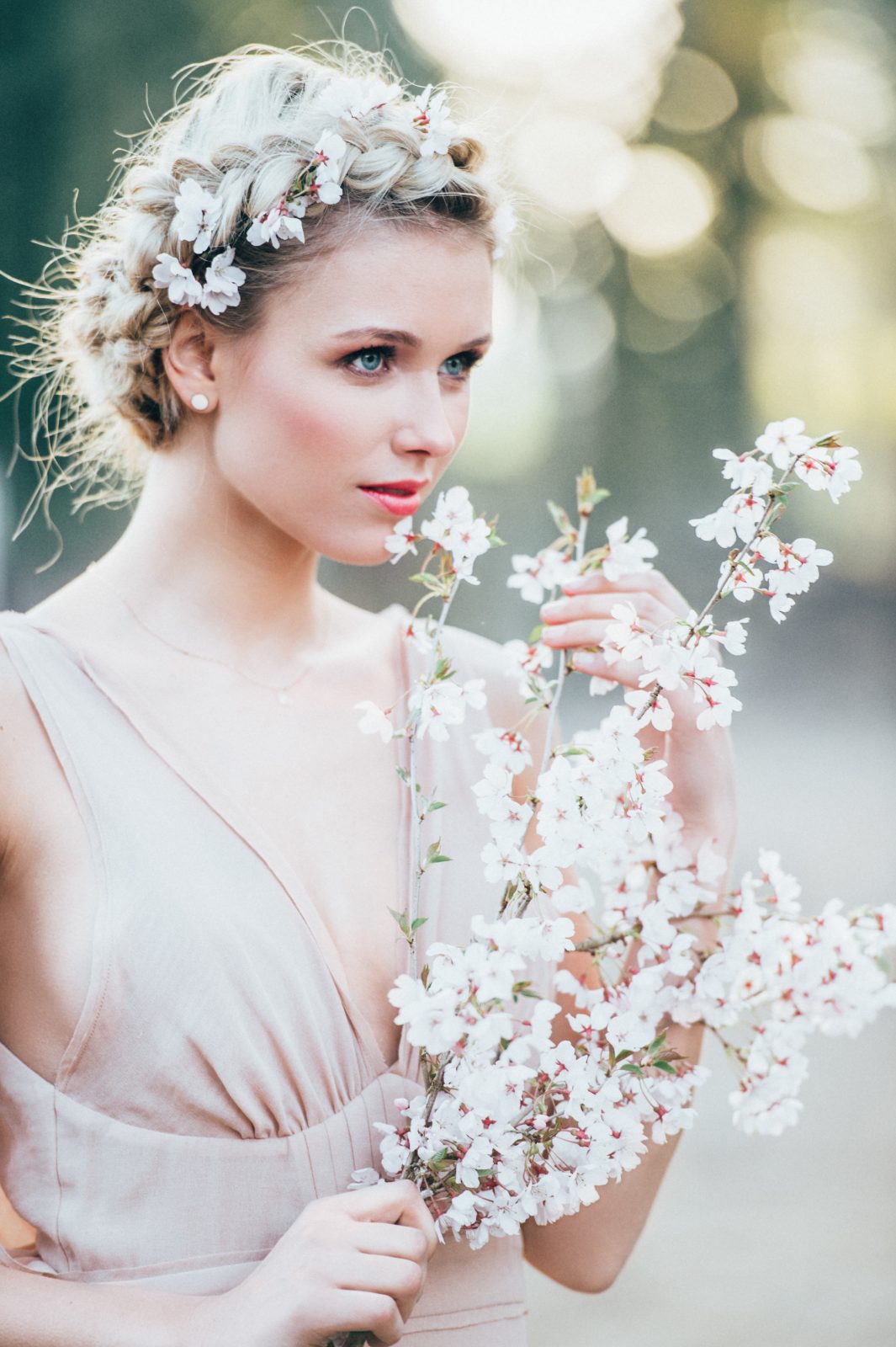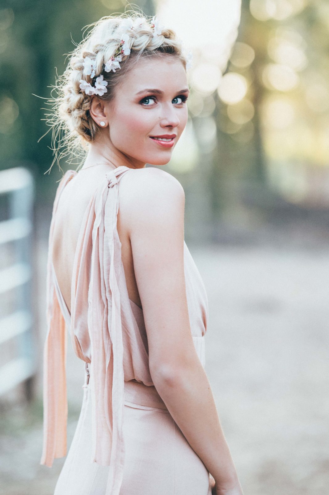 Das Make-Up unterstreicht den natürlichen Charme der Flechtfrisur. Ein strahlender Teint mit sanften Rosétönen und dezenten Highlights sorgt für Frische.