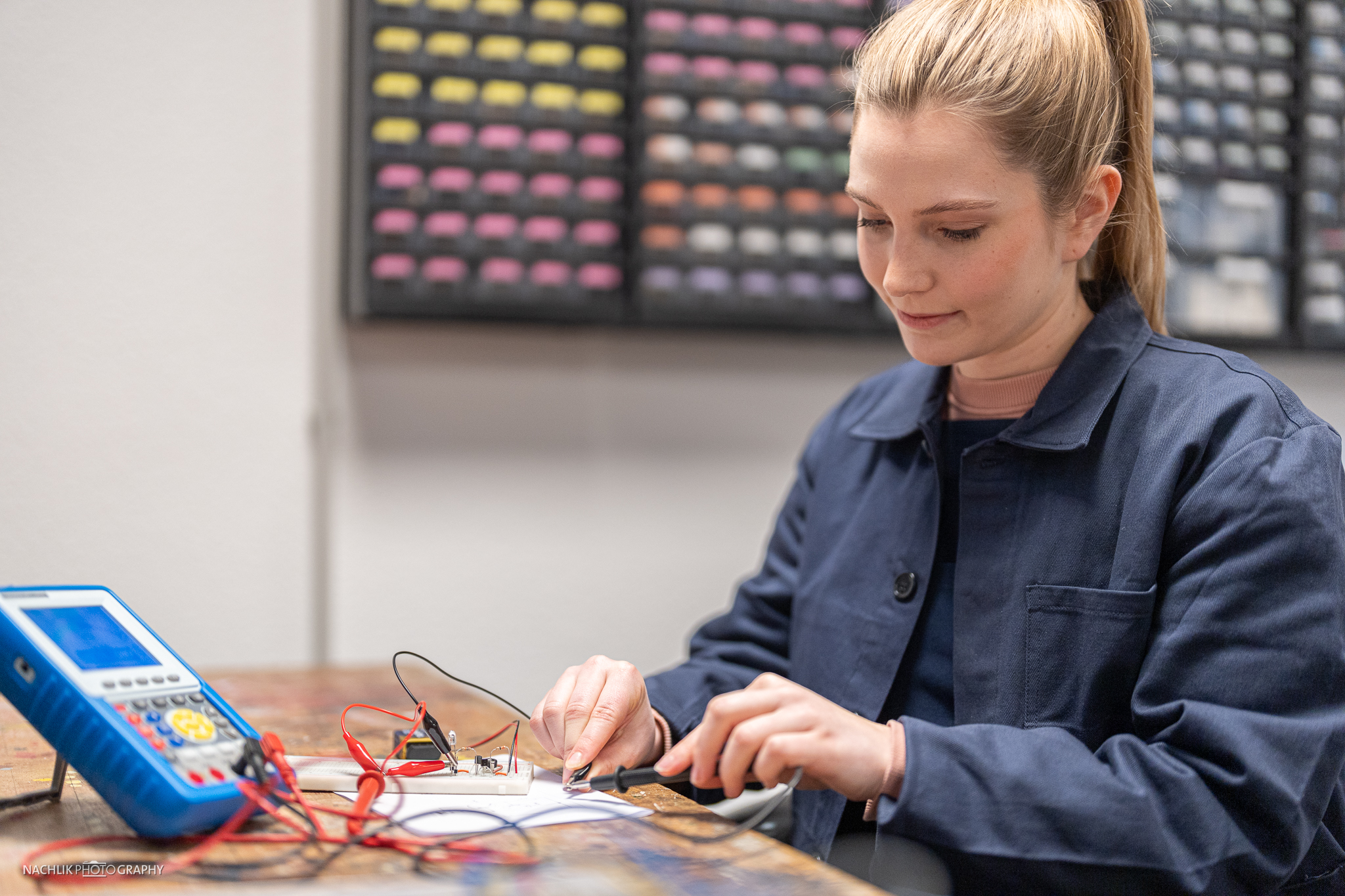 Das Haarstyling war natürlich und funktional, passend zur Umgebung und den Sicherheitsanforderungen im Betrieb. Die Haare wurden ordentlich zurückgesteckt, sodass sie unter Helmen oder Schutzbrillen sauber und gepflegt, dabei dennoch locker und wie selbst gemacht wirkten.